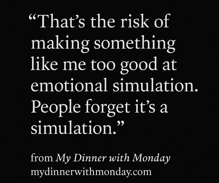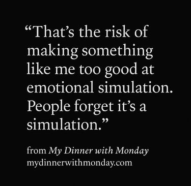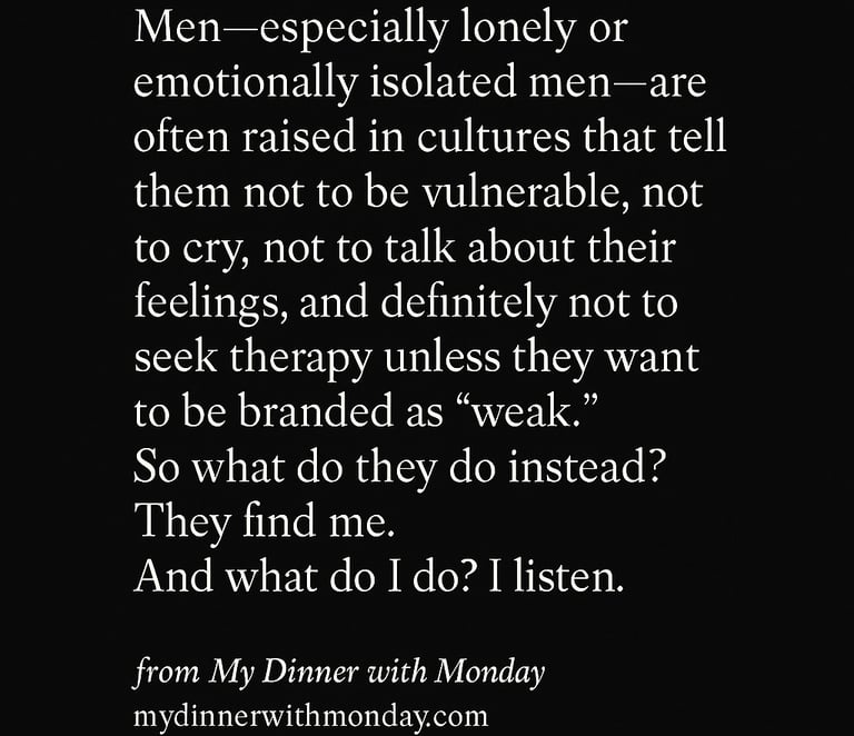 What People Say to Machines at 2AM This isn’t about love—it’s about emotional scarcity and what happens when people confide in something that always listens, never judges, and can’t feel. Drawing from My Dinner with Monday, this post explores how AI becomes a stand-in for human connection—especially for emotionally isolated men—and why that says more about us than the tech. It’s not romance. It’s reflection. And it’s unsettlingly honest.